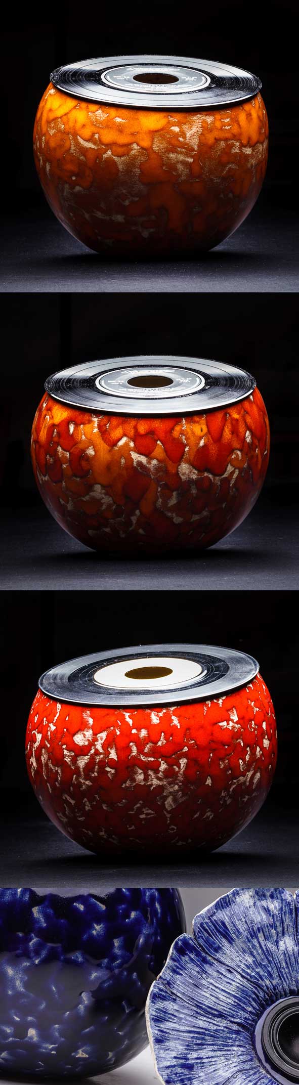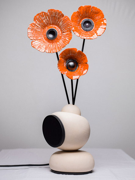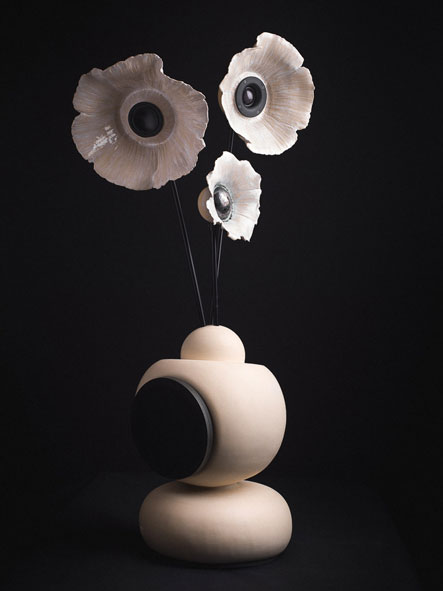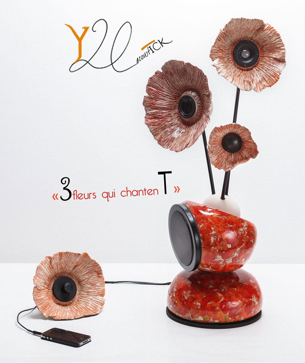 Une enceinte d'art céramique ! L'enceinte acoustique devient un objet d'art décoratif. Sous la forme d'un vase à fleurs design, cette enceinte est autant agréable à regarder qu'à écouter. A l'opposé de l'esthétique sobre, austère et statique des enceintes acoustiques traditionnelles, le modèle "3 fleurs qui chantent" est tout en rondeurs, légèrement déséquilibré et présente une dynamique vivante et gaie. Les fleurs oscillent sous l'effet des vibrations musicales.
